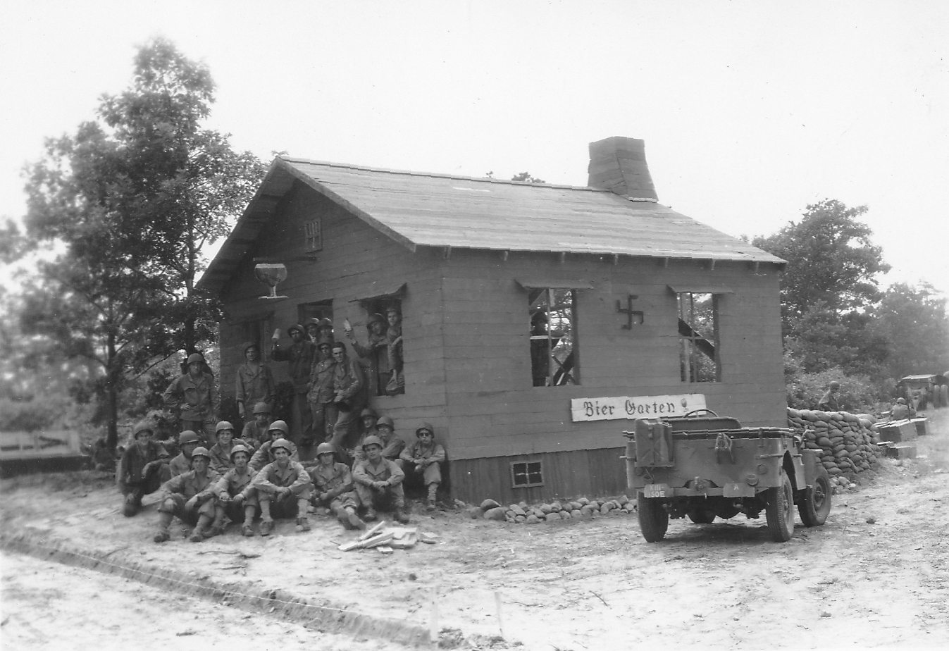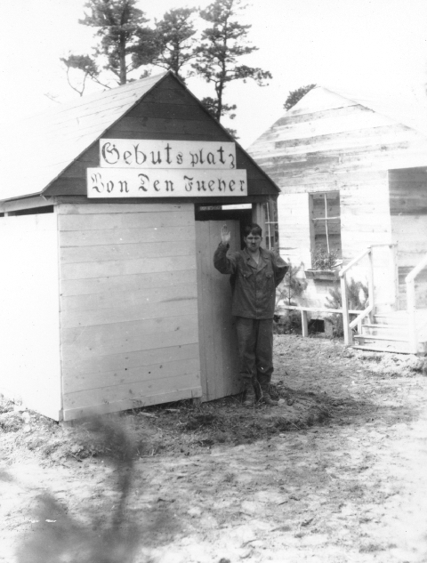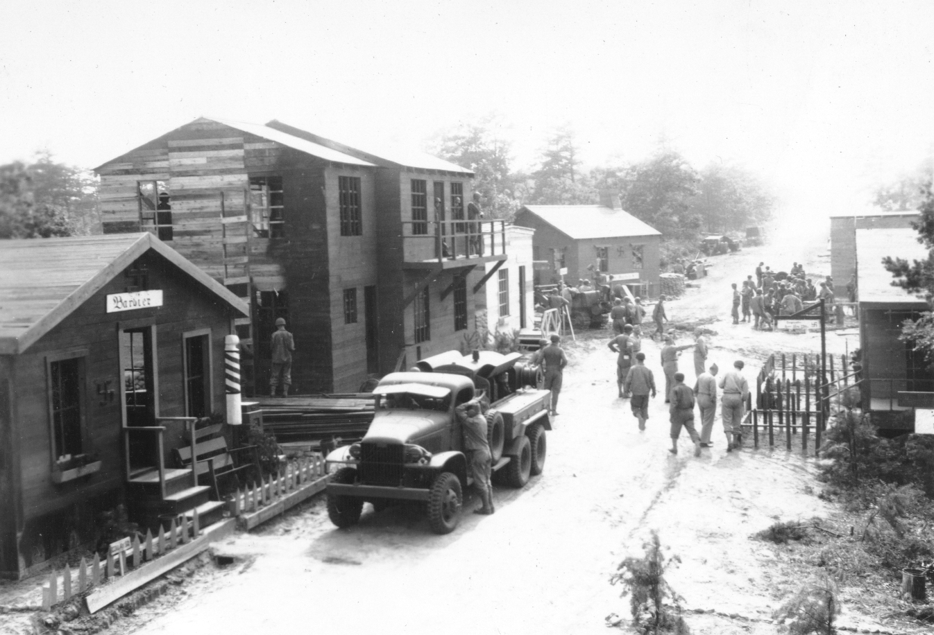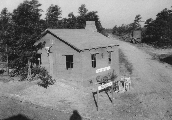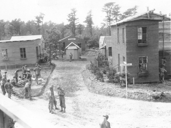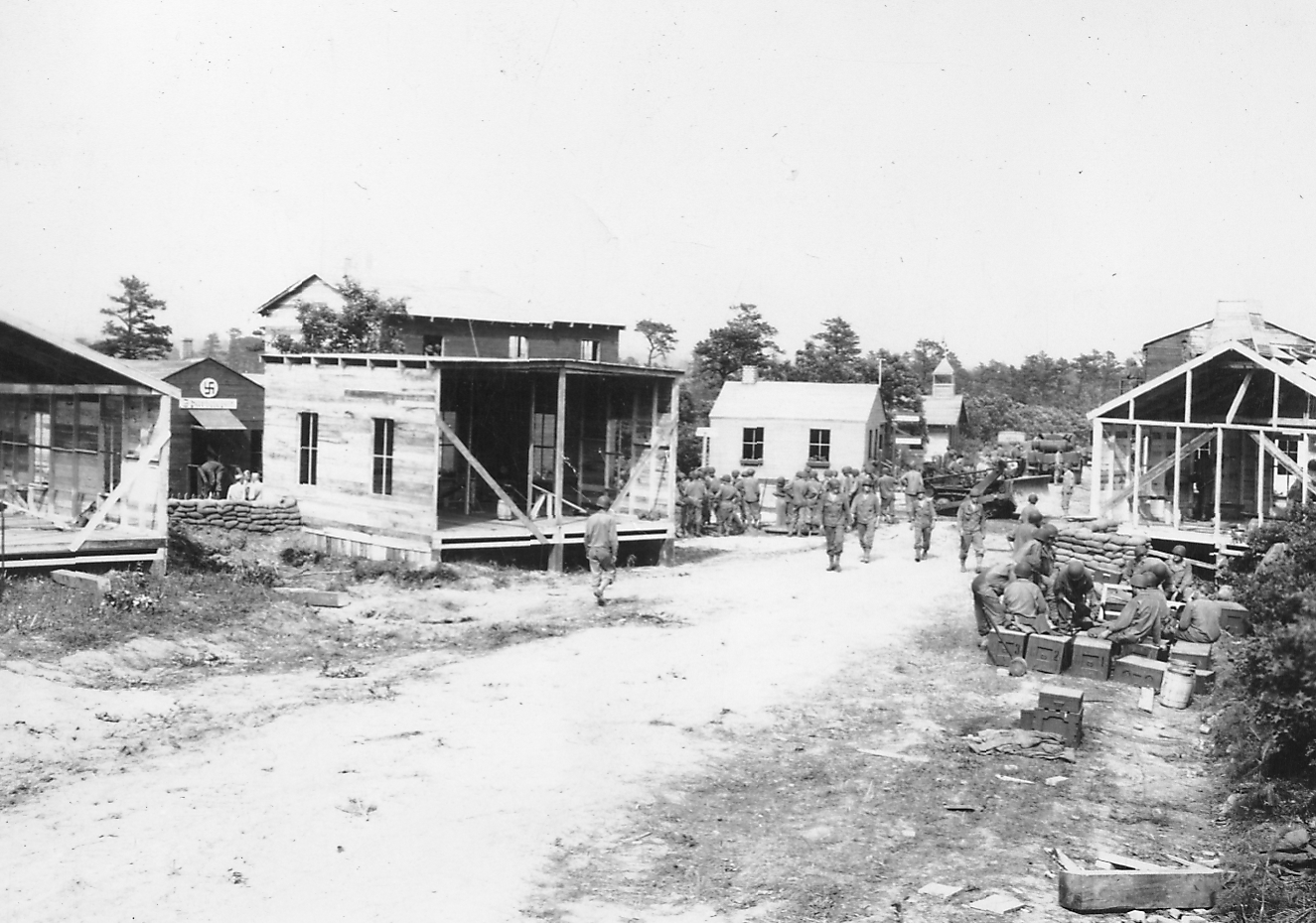 Published in the Boston Post, Monday July 19, 1943 Ready for Soldiers' Street Fighting Training CAMP EDWARDS, July 18 -- Visitors to this big, busy army training centre really stumbled into something here today when they walked smack into a mock German village of 15 buildings, each complete in every detail from German signs to flower boxes and bird houses, and even with the swastika mark on each structure. INTENSE TRAINING They quickly were given the reason, however, and it is that the replica has been erected to provide soldiers-in-training with actual village warfare conditions. It is located on a range area here and is the only village of its kind in New England. The village was constructed from a wooded area in these days by members of the 150th Engineer Combat Battalion from Fort Devens. The land was cleared and the buildings erected within two days, while the third day was spent in painting the structures and building targets which will be hidden inside the buildings and spring up as soldiers are trained in street fighting. New England engineers, working in two shifts, erected the village, which includes a schoolhouse, barber shop, restaurant, hotel, bakery, meat shop, beer garden, theatre, police headquarters, bank, mayor's house and other dwelling houses, and then added such decorative touches as fences, flower boxes, trellises, bird-houses and stone walls. NAMES IN GERMAN Names in German script identify the public buildings, the streets are named after Rommnel, Freidrich and Wilhelm. A swastika flies from the bell tower of the schoolhouse and other symbols of Naziism are used to give the area the appearance of the real thing. The modus operandum of the training is for a soldier to approach the village along Wilhelmstrasse, the main street. As the soldier advances on the alert for snipers, a control operator talks into a telephone from a position where he can observe the -area and orders another operator hidden in a nine-foot dugout behind the buildings to pull a certain target. The dugout operator then pulls a cord attached to a target and the target, a silhouette of a man - generally Hitler - springs up at a window, behind a door or a fence, or perhaps on a roof top. If the soldier is on the alert, he will spot the target and fire at it. In such a building as the hotel, soldiers will be instructed to seize it, room by room, using simulated grenades, and then advance to the next building by leaping across an alley or by scaling a fortified wall. Safety firing zones will be established along the streets for each target, so that all firing will be controlled to prevent wild shots from entering other ranges in the area. The village primarily will be used to acquaint troops with the technique of street fighting. |